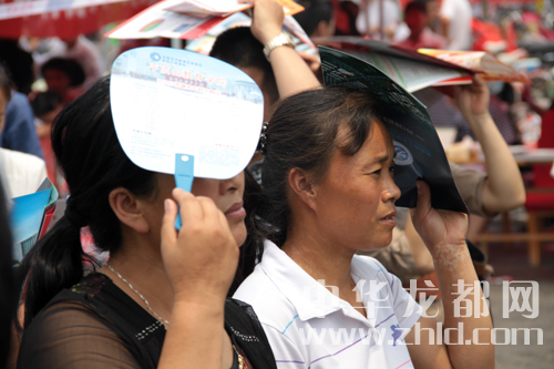 一考生家長(zhǎng)拿著宣傳單遮陽(yáng)。
