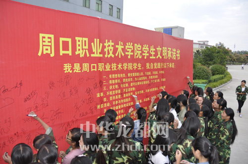 ????本報(bào)訊 昨日,周口晚報(bào)記者從周口職業(yè)技術(shù)學(xué)院了解到,新學(xué)期開始后,該校近萬(wàn)名在校大學(xué)生簽訂了《學(xué)生文明承諾書》。承諾書中包含十條學(xué)生守則,為學(xué)生們的校園生活指明了方向。