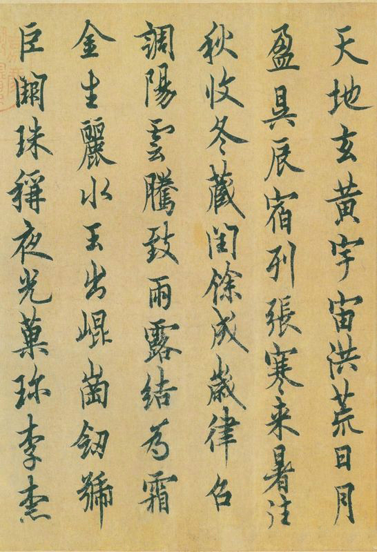 ????《千字文》全書共250句。每四字一句,四句一組,兩組一韻,前后貫通,互不重復。其內(nèi)容涉及天文、地理、歷史、農(nóng)工、園藝、飲食起居、修身養(yǎng)性及封建綱常禮教等各個方面。包羅萬象,涵蓋面廣泛,其最大優(yōu)點又在于融知識性、可讀性和教化性為一爐,誦讀一遍即感到文采斐然,合轍押韻,瑯瑯上口,易誦易記,梁武帝讀后,龍顏大悅,興奮不已。立即命令刻印,作為“諸王”的習誦課本,并刊諸于世,為初學者入門教本。從此,不僅中國帝王之家有了一本集識字、書法和思想內(nèi)容為一體的啟蒙讀物,而且中國社會乃至世界教育史上也有了問世最早、流傳最久、影響最大的蒙學教材。
