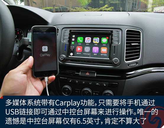 內飾方面,夏朗仍然傳承著大眾品牌的經典設計風格,基本不用分辨就知道這是一款大眾汽車。中央的多媒體系統(tǒng)功能豐富,并且?guī)в蠧arplay功能,只需要將手機通過USB鏈接即可通過中控臺屏幕來進行操作。唯一的遺憾是,夏朗的中控臺屏幕僅有6.5英寸,在現(xiàn)在看來肯定不算大了。