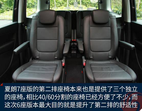 當然作為這次新增的車款,我們還是要重點介紹一下夏朗6座版相對于7座版的區(qū)別。首先要說明的是夏朗7座版的第二排座椅本來也是提供了三個獨立的座椅,相比40/60分割的座椅已經方便了不少,而這次提供的6座版本最大目的就是提升了第二排乘客的舒適性。