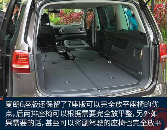同時,夏朗6座版還保留了7座版可以完全放平座椅的優(yōu)點,后兩排座椅可以根據需要完全放平整,只不過6座版在第二排中間會有個洞,不像7座版那么完美。另外如果需要的話,甚至可以將副駕駛的座椅也完全放平,將夏朗變成一款“商用車”。