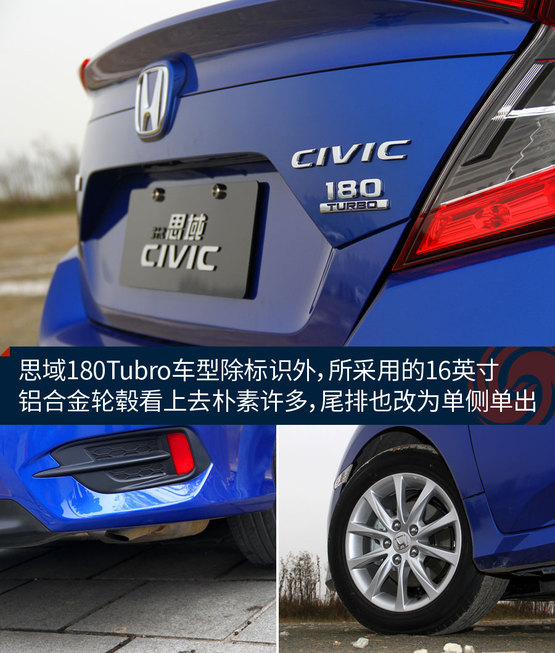 隨著思鉑睿混動車型的推出,這次走入門路線的思域1.0T也來打了個醬油。跟之前的1.5T車型相比,外形基本保持一致。鑒于其更入門的定位,輪轂的樣式看起來沒那么精致和動感了,尾排改為了單側(cè)單出的設(shè)計(jì),車尾的動力標(biāo)識也有之前的“220TURBO”改為“180TURBO”。