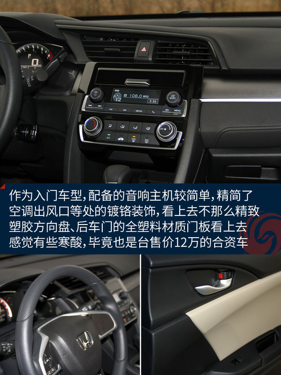 十代思域的內(nèi)飾精干又很有層次感,1.0T車型只是在用料上簡化了些,空調(diào)出風(fēng)口等處去掉了鍍鉻裝飾,看起來有點(diǎn)素。帶大屏幕的娛樂系統(tǒng)自然不會保留,換上的音響主機(jī)聽音樂、藍(lán)牙免提這些基本功能還是齊備的,不過車內(nèi)音響系統(tǒng)就只有兩個前門上各有一個的喇叭了。