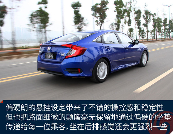 思域的定位一直偏向運(yùn)動,這一代車型自然不會放棄這一特色,底盤的扎實(shí)感、懸掛偏硬朗的設(shè)定都營造了同級別里相對出色的操控感受。不過懸掛系統(tǒng)在韌性方面相對薄弱,路感太強(qiáng)烈,鋪裝路面上細(xì)微的不平整所帶來的振動也比較清晰地傳遞到車內(nèi)。座椅的靠背包裹感還不錯,填充也比較得體,很舒服,但坐墊偏硬,因此行駛中車輛整體對振動的抑制能力欠佳,很大程度上影響了舒適性。