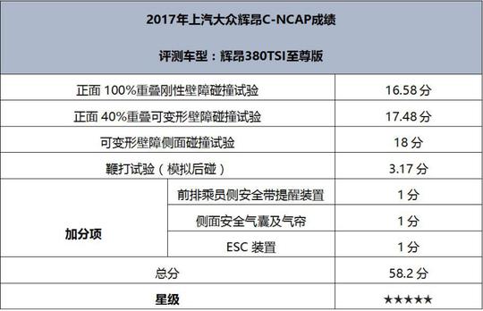 ????????輝昂成為“國家名片”,出色的安全性能同樣至關重要。在2017年度C-NCAP第一批車型的評價結果中,輝昂獲得58.2的高分,是C-NCAP 2015年版規(guī)則實施以來的最高分。