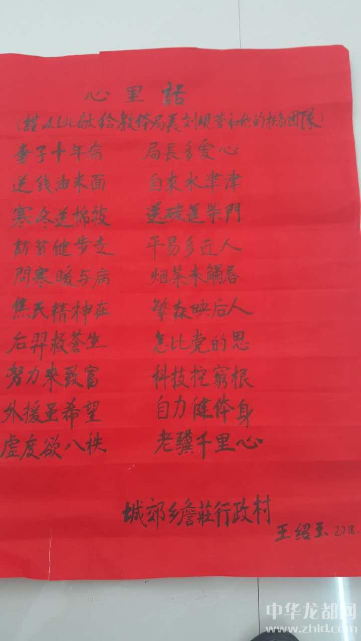 “我推敲了幾個(gè)半夜,寫了《心里話——謹(jǐn)以此獻(xiàn)給教體局局長劉現(xiàn)營和他的扶貧團(tuán)隊(duì)》這首五言排律,表表我和老伴及全村對(duì)您的感激之情?!薄捌拮邮瓴。珠L多愛心。送錢米油面,自來水津津。寒冬送棉被,送炭至柴門。訪貧健步走,平易又近人?!蓖踅B玉聲情并茂地朗讀著,劉局長爽朗地笑了,“老伴劉桂蘭藥按時(shí)吃了嗎?”“按時(shí)吃了,多虧您,到我家宣講扶貧政策,幫助我聯(lián)系有關(guān)單位,我老伴享受了慢性病醫(yī)保?!薄肮鹛m說,人家劉局長隔三差五給咱送米面油,逢年過節(jié)給咱送慰問金,前幾天頂風(fēng)冒雪送來兩床被子,一年不知來了多少趟,待咱比親人還親啊!我家也沒有什么拿出手的,我倆一合計(jì),就發(fā)揮我的一點(diǎn)專長,給您寫了首詩,您經(jīng)常去我家噓寒問暖,我今個(gè)也來您這,算是走走親戚吧,回報(bào)回報(bào)您!”