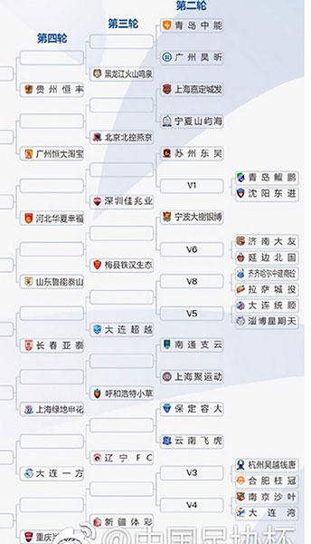 第三輪16支中甲球隊開打,加上從第二輪晉級的16支球隊,共32支球隊參賽,中甲球隊自動落位相應(yīng)客場簽位,即T1-T16簽位,本輪實行單場淘汰制,共16場比賽,勝者晉級第四輪。
