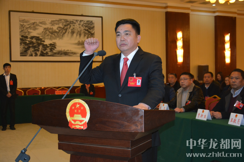 新當(dāng)選的太康縣監(jiān)察委員會主任何明照在大會現(xiàn)場進(jìn)行憲法宣誓