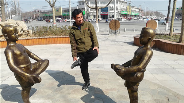在表現(xiàn)兒童游戲“斗雞”的雕塑前,兩個光背孩童獨腿站立,分別搬著另一條腿作戰(zhàn)斗準(zhǔn)備。那生動的畫面,令40多歲的市民尚巖青忍俊不禁,他也獨腿站在雕塑中間,像個開心的孩子一樣,搬著腿和雕塑中的頑童組成一起斗雞的場景。