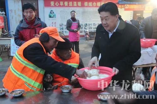 中華龍都網(wǎng)訊(周口報(bào)業(yè)全媒體記者 馬治衛(wèi) 通訊員 徐孫楊)3月20日早,新疆河南總商會會長朱軍一行從新疆專程趕往太康,為該縣“愛心早餐”工程捐款10萬元,并親自為環(huán)衛(wèi)工人端菜送饅頭,并向志愿者和環(huán)衛(wèi)工致以親切地慰問。