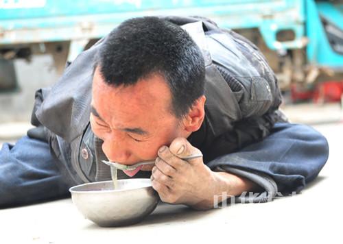 媽媽乘上一碗放在地上,紅印坐在墊子上,用腳夾著勺子,彎下腰來(lái)吃得很香??吹郊t印吃飯那么費(fèi)力,在場(chǎng)人心里酸酸的,為紅印自強(qiáng)不息所打動(dòng)著。可是當(dāng)初娘倆可沒少流眼淚,李新蘭發(fā)現(xiàn)兒子兩只腳是靈活完好的,就開始訓(xùn)練他用腳吃飯、洗臉。養(yǎng)大一個(gè)正常的孩子尚且不易,何況是張紅印這樣的孩子?李新蘭一遍遍地教,年幼的張紅印一遍遍地學(xué)。難為到受不了時(shí),娘倆就抱在一起哭。