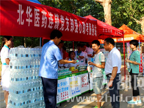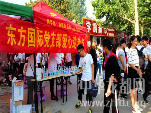 愛心助考活動現(xiàn)場,西華縣真愛醫(yī)院黨支部設(shè)立的“黨旗引領(lǐng)、護(hù)航高考”的大紅愛心助考條幅分外惹眼,黨員志愿者們免費(fèi)為考生提供藿香正氣水、風(fēng)油精、退燒藥等,并有醫(yī)護(hù)人員現(xiàn)場提供急救服務(wù)。在西華縣恒生醫(yī)院黨支部愛心助考點(diǎn)前,3名醫(yī)護(hù)人員正在免費(fèi)為考生及家長提供風(fēng)油精、清涼油、仁丹、藿香正氣水等防暑降溫藥品和急救藥品,還有擔(dān)架、120急救車輛等。西華縣北華醫(yī)藥黨支部愛心助考服務(wù)站的黨員志愿者,正在向考生免費(fèi)提供防暑降溫藥、感冒發(fā)燒藥、拉肚子藥等藥品。黨員志愿者愛心企業(yè)代表宋女士說:“在高考期間,我們?yōu)榭忌凹议L免費(fèi)提供礦泉水、芭蕉扇、清涼油等多項(xiàng)服務(wù),除了愛心,更多的是一份責(zé)任和使命?!?/p>