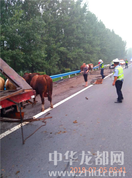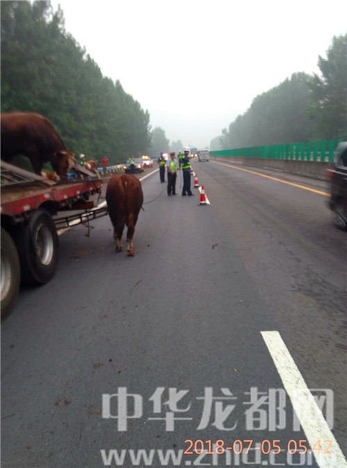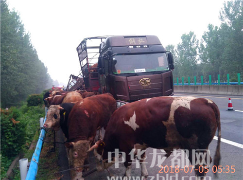 中華龍都網(wǎng)訊(周口報業(yè)全媒體記者 姬慧洋 通訊員 劉杰 文/圖)“在大廣高速2025公里西半幅附近發(fā)生一起單方事故,幾十頭牛散落在路面,請求處警。”7月5日5時許,周口市公安局交通管理支隊高速二大隊扶溝中隊接到110指令稱。