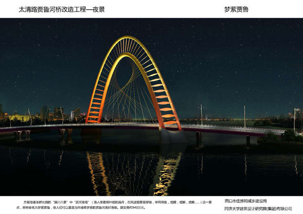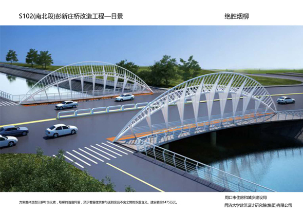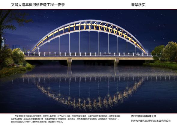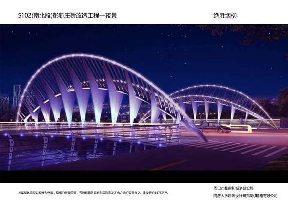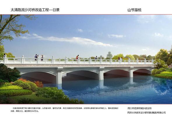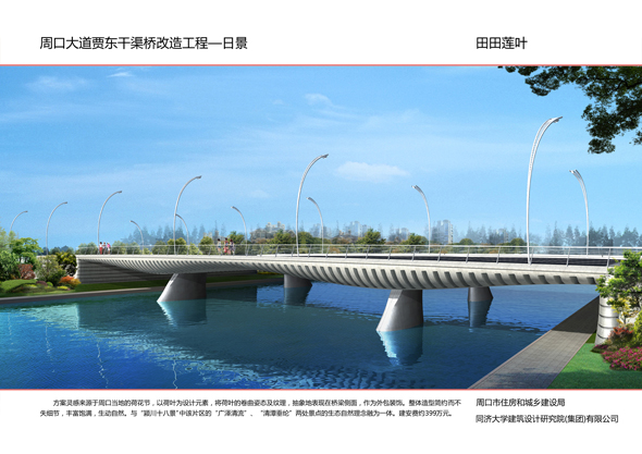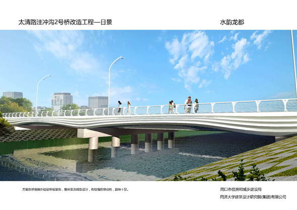 周口大道沙潁河橋景觀改造,設(shè)計造型簡單柔美,如行云流水,同時與沙潁河景觀帶相融合,給城市增添了生機(jī)與活力。周口大道賈東干渠橋以荷葉為設(shè)計元素,造型簡約而不失細(xì)節(jié)。周口大道流沙河橋造型簡潔大氣,線條流暢,像一條青龍游弋在水面上。文昌大道幸福河橋以花瓣、葉子為設(shè)計元素,造型豐富多彩。文昌大道流沙河故道橋在中分帶位置修建花壇,花壇造型莊重古樸,景石造型端莊沉穩(wěn)。太清路流沙河橋以古建斗拱、窗花為元素,造型儒雅大方。太清路洼沖溝2號橋以“輻轂相依”為名,既融合環(huán)境,又有團(tuán)結(jié)、合作的寓意。太清路賈魯河橋,增加了景觀造型,使人們可以重溫當(dāng)年賈魯河的美好畫卷。彭新莊橋以柳葉為元素,預(yù)示著留住賓客與送別親友的不舍之情的雙重含義。