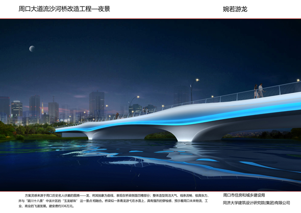 中原路跨沙潁河大橋,橋型采用下承式組合拱橋,遠(yuǎn)看像一輪新月,展現(xiàn)出了“一輪明月照古城”的美景。洼沖溝政通路橋以”振翅高飛的翅膀“為造型元素,在新建人行道橋內(nèi)側(cè)采用鋼結(jié)構(gòu)塑造翅膀造型,同時對人行橋營造出廊道的意境。洼沖溝人和路橋以“太極魚”為設(shè)計元素,體現(xiàn)“天人合一”。流沙河騰飛路橋拱圈外傾,形似一只翩翩起舞的蝴蝶。流沙河大成路橋兼具現(xiàn)代鋼橋和傳統(tǒng)拱橋的美感,充分體現(xiàn)周口厚重的歷史文化。