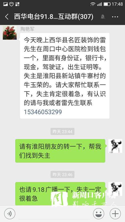 很快,一條尋找失主的愛心信息,便通過無線網(wǎng)絡,乘著夜色翅膀,在豫東大地的西華縣政協(xié)群、西華縣非公黨工委群、西華縣城市管理群、西華縣愛心粥屋群、西華電臺91.8互動群、周口市個私協(xié)會系統(tǒng)群、淮陽縣非公黨工委群、淮陽縣文明辦群、淮陽縣城市管理群等微信群迅速散發(fā)開來。很多群友進行轉發(fā)、點贊。