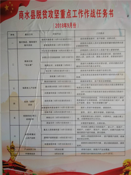 “‘脫貧攻堅(jiān)重點(diǎn)工作作戰(zhàn)任務(wù)書’既是作戰(zhàn)圖、也是軍令狀,每個(gè)時(shí)間點(diǎn)開展哪些工作、達(dá)到什么效果、采取何種措施,都在‘作戰(zhàn)任務(wù)書’上顯現(xiàn)了出來(lái)?!?月5日上午,商水縣練集鎮(zhèn)朱集村脫貧責(zé)任組組長(zhǎng)陳書敬指著張貼在村辦公室內(nèi)的“商水縣脫貧攻堅(jiān)重點(diǎn)工作作戰(zhàn)任務(wù)書”說(shuō)。