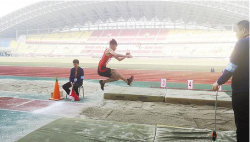 10月24日上午,河南省第七屆殘疾人運(yùn)動會跳遠(yuǎn)比賽在市體育中心體育場進(jìn)行。在跳遠(yuǎn)賽場,參賽選手完成每一次跳躍后,都會與裁判員進(jìn)行溝通,認(rèn)真對待比賽。 ②8 記者 牛思光 攝
