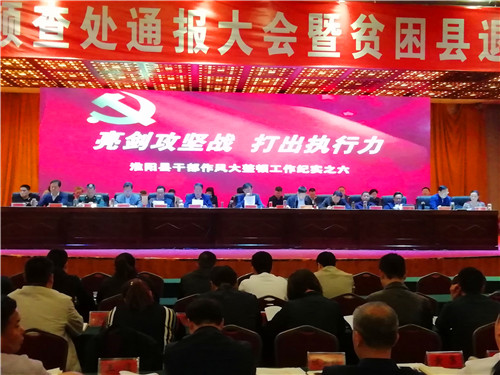 10月31日上午,淮陽縣干部作風大整頓查處通報大會暨貧困退出縣級自評動員會在羲皇賓館東三樓會議廳召開??h委書記馬明超出席會議并講話,縣長王毅主持會議,縣委副書記、政法委書記岳新坦宣讀《脫貧攻堅督查通報》,縣委常委、縣紀委書記、縣監(jiān)委主任王之夢宣讀《通報》,被通報單位負責人作表態(tài)發(fā)言。