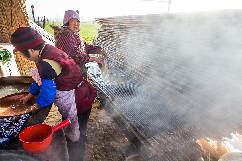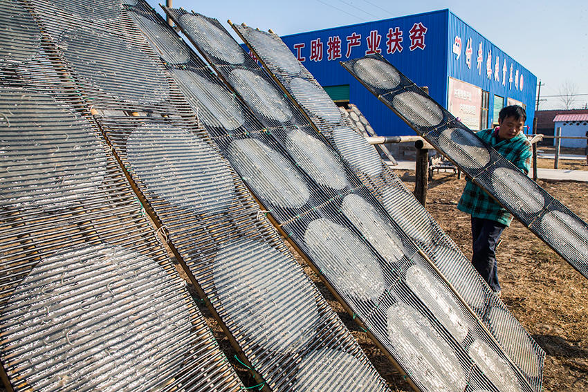 寒冬,河南省沈丘縣付井鎮(zhèn)楊莊村子里,一個個制作粉皮的工棚里爐火正旺,熱氣騰騰的大鍋里漂出一張張粉皮。田野中,到處是晾曬粉皮的場景,真是難得一見。