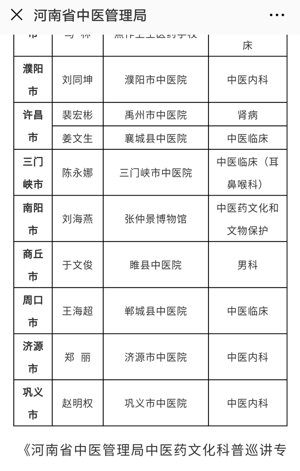 《通知顯示》,為加強(qiáng)全省中醫(yī)藥文化科普人才隊(duì)伍建設(shè),經(jīng)培訓(xùn)考核,張世卿、王海超等34位同志被遴選為第二批河南省中醫(yī)藥文化科普巡講專家,聘期三年。