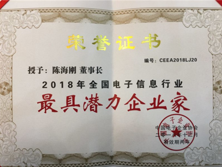 在當(dāng)日下午召開的全國電子信息行業(yè)優(yōu)秀企業(yè)家表彰大會上,公司董事長陳海剛榮獲“2018年全國電子信息行業(yè)最具潛力企業(yè)家”榮譽(yù)稱號。