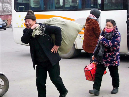 男男女女老老少少,帶著大包小包的年貨,急切而快樂(lè)地回家過(guò)年。