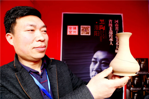 在河南省非物質(zhì)文化遺產(chǎn)黑陶技藝展示臺(tái)前,代表性傳承人、淮陽(yáng)縣工藝美術(shù)家協(xié)會(huì)主席張輝,正在向游客介紹黑陶的發(fā)展歷程。隨處可見(jiàn)的普通膠泥,經(jīng)過(guò)匠人之手便可變成精美的黑陶器具,這讓眾人感嘆不已。張輝說(shuō),這是老祖宗留下的智慧結(jié)晶,也是非物質(zhì)文化遺產(chǎn)的寶貴財(cái)富,他要永遠(yuǎn)傳承下去。