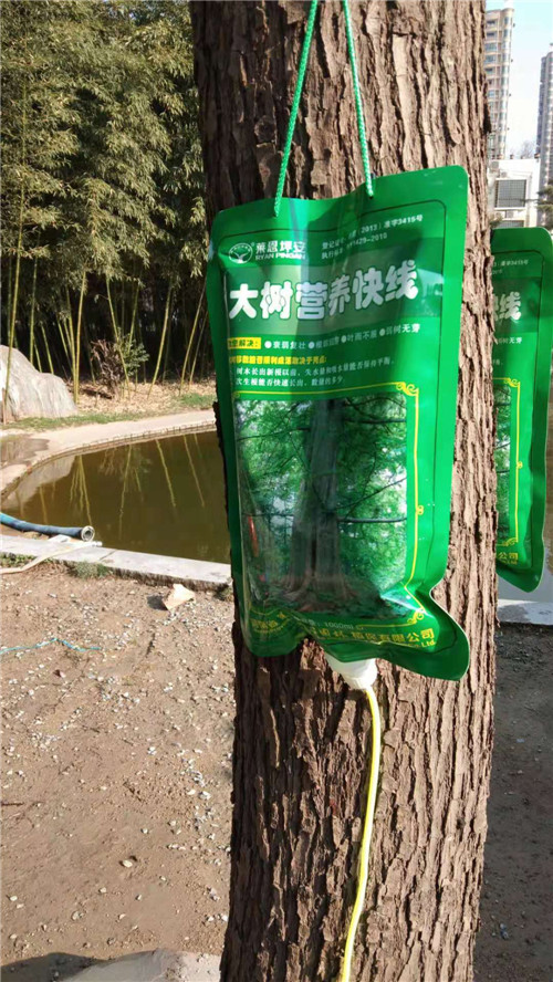 3月18日,記者在市教體局院里看到,幾棵樹上都掛著一個(gè)綠色的塑料袋,塑料袋上寫著“大樹營(yíng)養(yǎng)快線”,袋口向下連著一個(gè)導(dǎo)管,導(dǎo)管與普通的輸液器非常相像,只是在中間的位置分成了兩根,分出來的兩根導(dǎo)管末端各連著一個(gè)針頭,針頭插進(jìn)大樹接近樹根的位置。據(jù)悉,這些“營(yíng)養(yǎng)快線”可以為樹木補(bǔ)充營(yíng)養(yǎng)和水分,促進(jìn)樹木生根、發(fā)芽,幫助樹木增強(qiáng)抗病能力,提高樹木的成活率,保證樹木整體長(zhǎng)勢(shì)。
