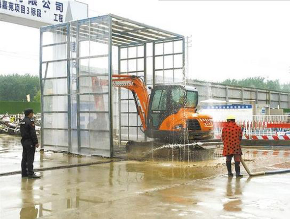 4月27日上午,川匯區(qū)一工地大門口,準(zhǔn)備駛出工地的工程車正接受清洗。工作人員說,每輛工程車都有規(guī)定的清洗時間,一般是兩分多鐘,保證從工地出去的車輛干干凈凈。記者 王凱 攝