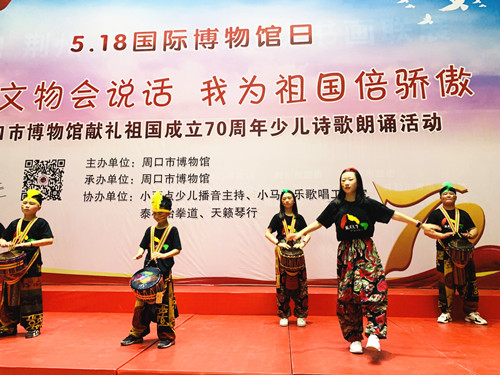 5月18日國際博物館日當(dāng)天,周口市博物館舉行系列主題活動(dòng)“如果文物會(huì)說話,我為祖國倍驕傲”詩歌朗誦活動(dòng)、文物繪畫作品展活動(dòng)。在活動(dòng)現(xiàn)場,小朋友們帶來了精彩紛呈的節(jié)目,有根據(jù)市博物館的文物創(chuàng)作的詩歌作品《文物會(huì)說話:漢代玉豬》《文物會(huì)說話:戰(zhàn)國青龍玉佩》,有集體朗誦《中華頌》《初生的太陽》《我驕傲我是中國人》,還有獨(dú)唱、舞蹈、相聲、跆拳道、非洲鼓表演等,共同為本次活動(dòng)增光添彩。