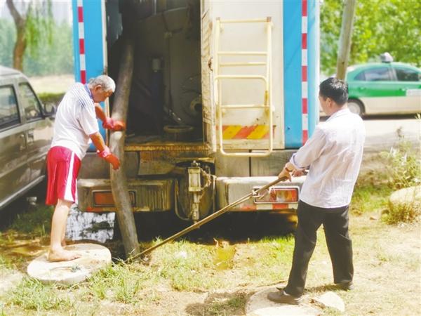 站在公廁旁的污水邊,該負(fù)責(zé)人指揮專(zhuān)門(mén)處理糞液的車(chē)輛到達(dá)現(xiàn)場(chǎng),并就該公廁的情況向記者進(jìn)行說(shuō)明?!斑@個(gè)公廁是由市園林處負(fù)責(zé)修建的,建好投入使用的時(shí)候就沒(méi)有鋪設(shè)污水管道,只配套了一個(gè)能容納9立方米污水的化糞池。因?yàn)楦浇行V場(chǎng),健身的市民多,公廁使用的頻率高,一個(gè)化糞池不夠用,我們又增加了一個(gè)能夠容納10立方米污水的化糞池,定期進(jìn)行清理。”該負(fù)責(zé)人說(shuō)。