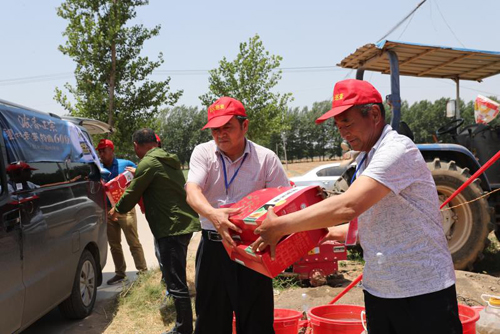 6月4日中午,太康縣委宣傳部常務(wù)副部長(zhǎng)趙勇與瀘州老窖(懷舊)公司豫南區(qū)負(fù)責(zé)人劉光軒等工作人員一起,在王集鄉(xiāng)慰問后又不顧炎熱來到了馬廠鎮(zhèn)麥?zhǔn)找痪€,給工作人員送去礦泉水、粽子、牛奶等用品。