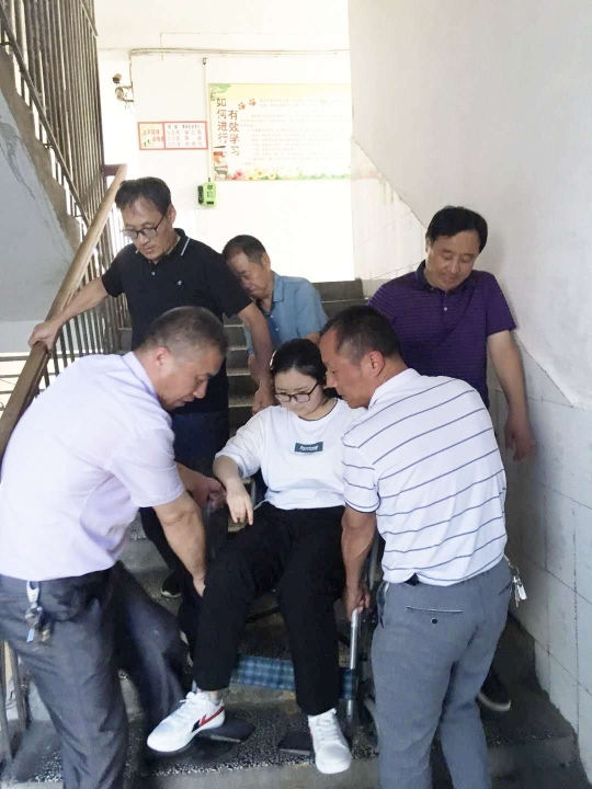 “考慮到她行動(dòng)不便,我們適當(dāng)?shù)卣{(diào)整了桌子之間的距離?!绷_明中表示,兩天來,晉淼在實(shí)驗(yàn)中學(xué)考點(diǎn)服務(wù)工作人員的幫助下,從一樓抬進(jìn)三樓考場(chǎng)。每場(chǎng)考場(chǎng)結(jié)束后,考點(diǎn)工作人員又把她從三樓抬下來,推到家長(zhǎng)身邊。