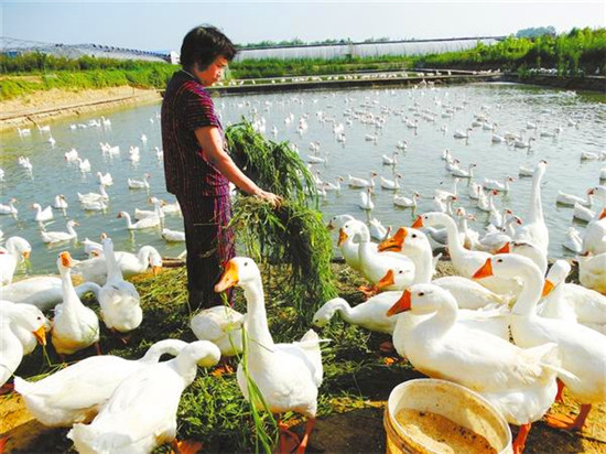 7月16日,沈丘縣周營鎮(zhèn)馬營村生態(tài)鵝養(yǎng)殖基地,工人正在喂養(yǎng)生態(tài)鵝。近年來,該鎮(zhèn)充分利用得天獨(dú)厚的生態(tài)環(huán)境優(yōu)勢,積極引導(dǎo)群眾發(fā)展訂單生態(tài)土雞、肉鵝、槐山羊等特色養(yǎng)殖產(chǎn)業(yè),全力促進(jìn)農(nóng)民增收致富。謝辛凌 攝