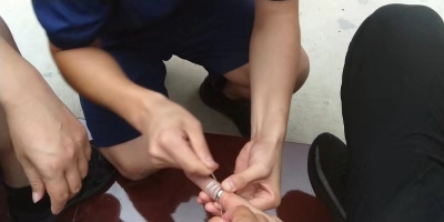 經過查看,由于尺寸不合適,該男子左手中指已經被戒指卡的出現(xiàn)充血,手指腫脹嚴重??紤]到用剪切器等器械剪戒指可能會傷到手指,指戰(zhàn)員利用纏線解線的方法,用細線穿過戒指在手指上纏繞,然后慢慢拉線,利用細線的滑潤效果幫助取下戒指,很快戒指被成功取下。