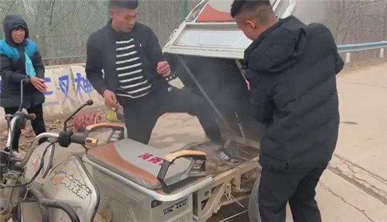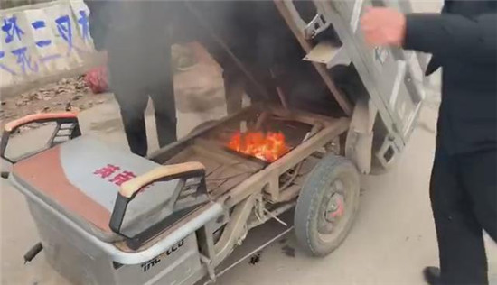 “當(dāng)時在我們前方的一輛電動三輪車駕駛座下冒出黑煙,車上兩位老人察覺到危險后,急忙下車,站在一旁不知所措。我們也緊跟上前。事發(fā)突然,現(xiàn)場沒有滅火器和可利用水源,而三輪車的火越來越大,兩位老人著急萬分,在旁邊不停地請求我們幫幫她們。根據(jù)經(jīng)驗,我們當(dāng)機立斷利用路邊的泥土進(jìn)行撲救,經(jīng)過幾十秒的緊張撲救,著火部位被成功撲滅?!比幌狸爢T回憶說三輪車是電線短路引起的電瓶著火。