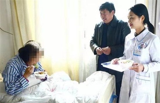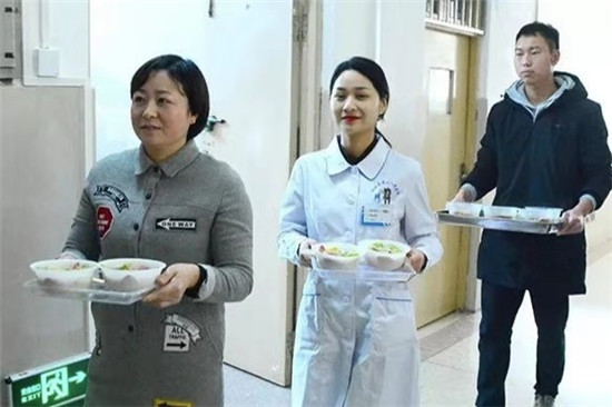 餃子煮好,盛入碗內(nèi),端入病房,親手送到患者手中,看到患者品嘗餃子時的開心樣子,醫(yī)護人員從心里笑到了臉上。