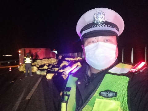 2月15日晚,一輛滿載著蔬菜的大貨車在大廣高速周口轄區(qū)內(nèi)側(cè)翻,一車娃娃菜傾倒在高速路上,占據(jù)了兩個(gè)車道,急需救援。市公安局交通管理支隊(duì)高速二大隊(duì)民警接警后迅速救援,幫助運(yùn)送保障物資的司機(jī)先去送貨,再回來(lái)處理事故。