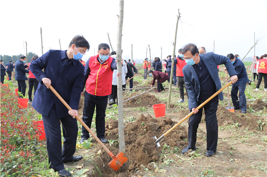 在義務植樹活動現(xiàn)場,參加植樹的縣領導率先垂范,紛紛拿起植樹工具,種下了一棵棵樹種,為初春的鄲城大地增添新綠。在縣領導的帶領下,參加植樹的志愿者們也紛紛行動起來,大家兩人一伙,三人一群,揮鍬培土、正苗踩實,道道工序細致認真、有條不紊。放眼望去,一排排新栽下的樹種整齊排列、迎風而立,展現(xiàn)一片蓬勃生機。
