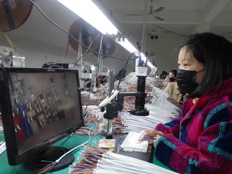 近日,沈丘縣周營鎮(zhèn)眾邦電子來料組裝扶貧車間內(nèi),當?shù)卮迕裼秒娔X檢驗細微端子產(chǎn)品質(zhì)量。