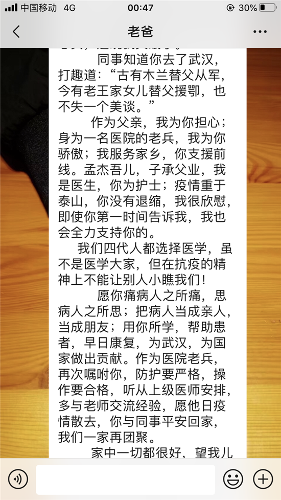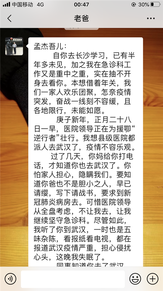 作為父親,我為你擔(dān)心;身為一名醫(yī)院的老兵,我為你驕傲;我服務(wù)家鄉(xiāng),你支援前線。孟杰吾兒,子承父業(yè),我是醫(yī)生,你為護(hù)士;疫情重于泰山,你沒有退縮,我很欣慰,即使你第一時(shí)間告訴我,我也會全力支持你的。