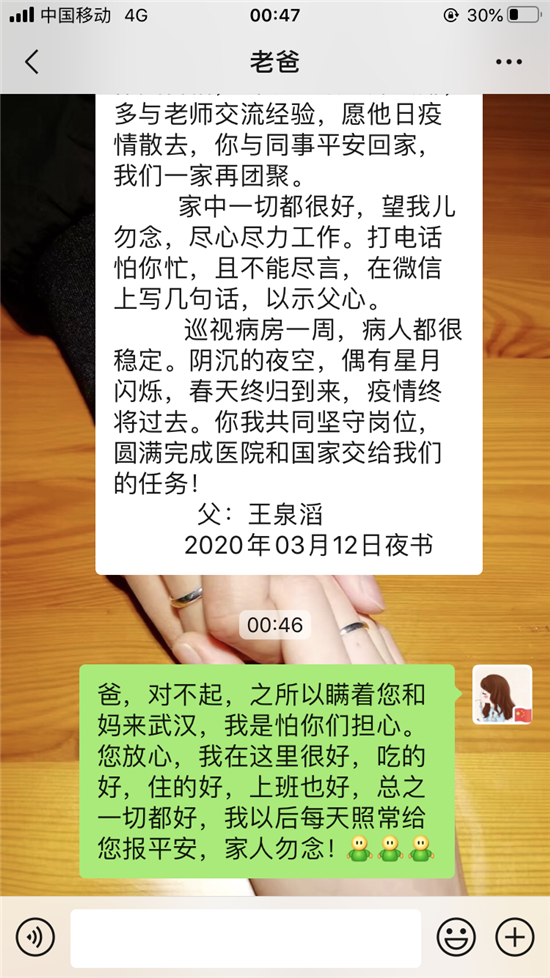 3月21日,周口援鄂醫(yī)療隊(duì)出征滿一月。當(dāng)晚,王泉滔通過微信又鄭重給女兒說下這番話:一晃你在武漢一個(gè)月了,我和家人從你去武漢的擔(dān)心到現(xiàn)在的放心,這是國家給予我們的安心。農(nóng)民把地種好,教師把學(xué)教好,士兵把國門守好,醫(yī)護(hù)把病治好,都是自己的使命,更是自己的初心。人人懷揣私字,社會必?cái)?,遭殃的終歸眾人;眾人心懷天下,萬物皆勝,受益的定是人人??吹胶幽喜糠衷踽t(yī)療隊(duì)從武漢凱旋歸來,雖然沒有你的身影,但是我們很高興,說明武漢的疫情已得到控制,我和家人一起期盼你早日歸來。但是還是要再次叮囑你,不要因?yàn)橐咔榈搅俗詈蠖潘删?,上下班路上注意安全,穿脫防護(hù)服不能有一絲懈怠,時(shí)刻保持警醒。年前你當(dāng)了姑姑,雖然還沒有見到你侄子,但他和家人共同期待你平安回來。吾兒加油!