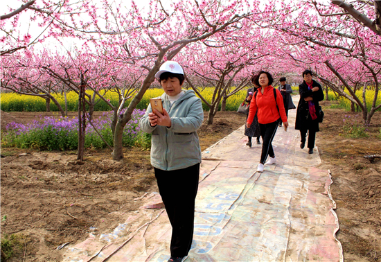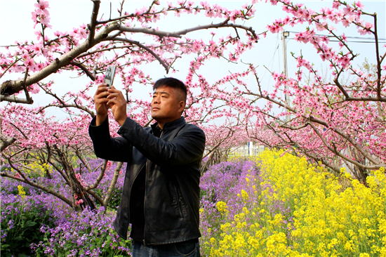 “老鐵們,今年桃花節(jié),因受疫情影響,是網(wǎng)上舉辦的,喜歡看黃橋桃花的網(wǎng)友,不要遺憾,我是您的忠實老鐵,每天會準時給您分享桃花節(jié)的美景圖片及視頻,讓您足不出戶觀賞到萬畝桃園桃花盛開的美景?!?月22日,在西華縣潁河灣生態(tài)采摘園,網(wǎng)紅“西華桃子哥”和合盛正在拍攝桃園美景,一邊通過抖音、快手、微信群向網(wǎng)友拍攝上傳桃花盛開的視頻、圖片等美景,一邊樂此不疲地口中念念有詞道。