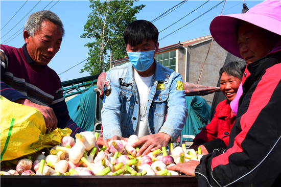 4月26日下午,記者在淮陽縣王店鄉(xiāng)107國道沿線看到,各個(gè)大蒜的收購點(diǎn)車來車往,蒜農(nóng)們拉著新蒜賣給小販們。盡管今年春季雨水較少,天旱土地墑情較差,但是上萬畝大蒜,在蒜農(nóng)們施肥澆水管理下,長勢不錯(cuò),每畝產(chǎn)量在3000斤到4000斤之間,迎來疫情下的大蒜豐收。