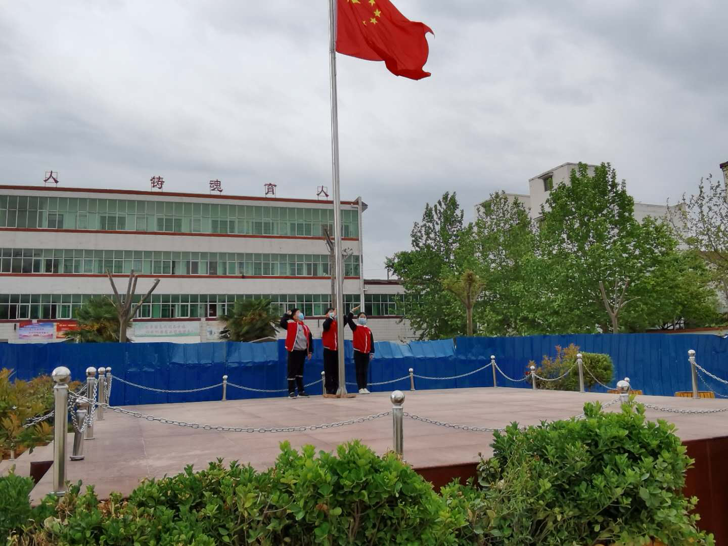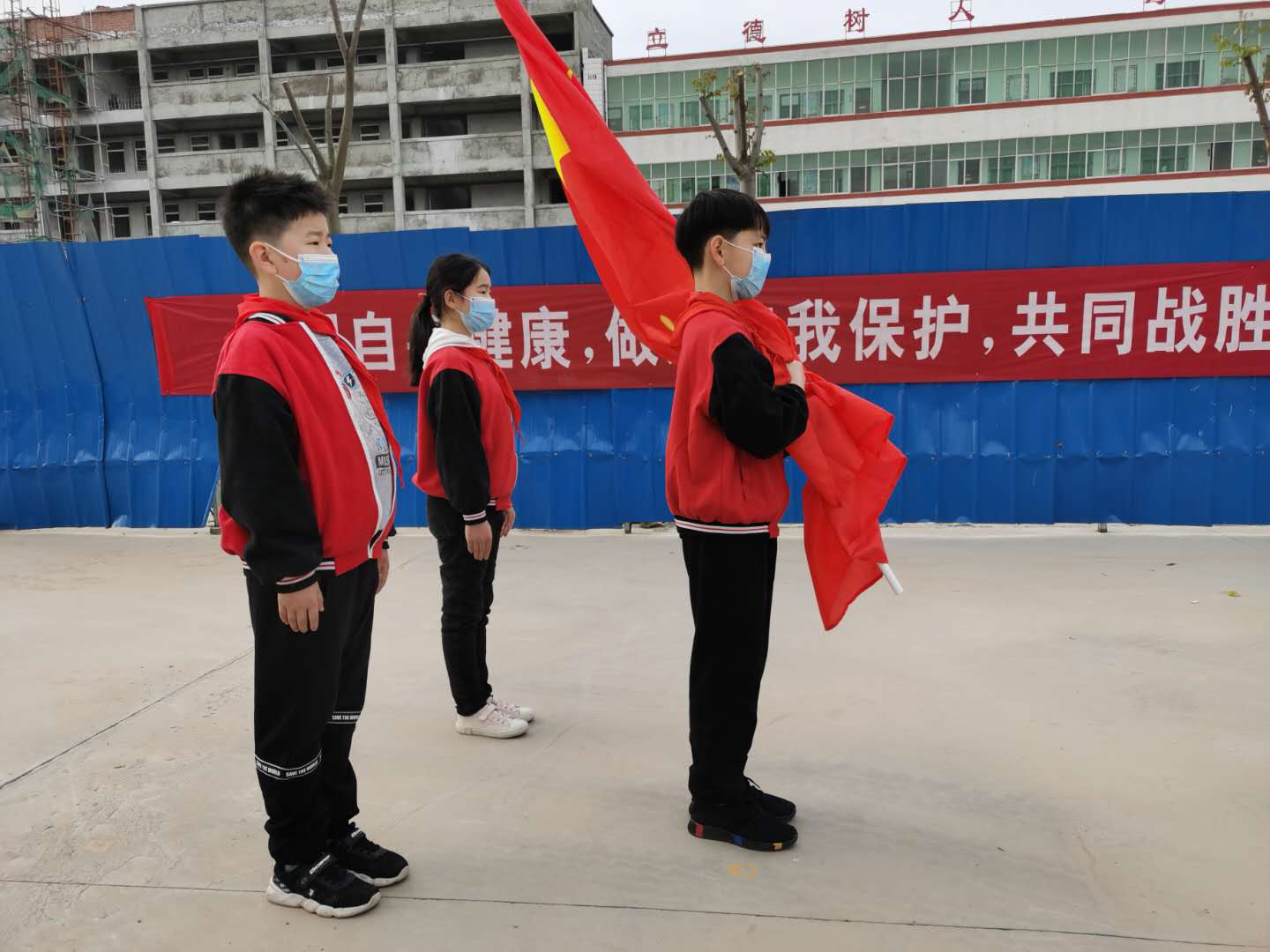 這是一次特殊的升國旗儀式,三名國旗手在操場上將五星紅旗冉冉升起,升旗實(shí)況同步轉(zhuǎn)播到教室內(nèi)的電視屏幕上,同學(xué)們在各自教室里面向國旗莊嚴(yán)肅立、齊唱國歌,面向國旗敬禮,在國旗下立下一個(gè)志,將來成為一個(gè)對社會(huì)有貢獻(xiàn)的人,能夠?yàn)樯鐣?huì)做出突出成績的人。