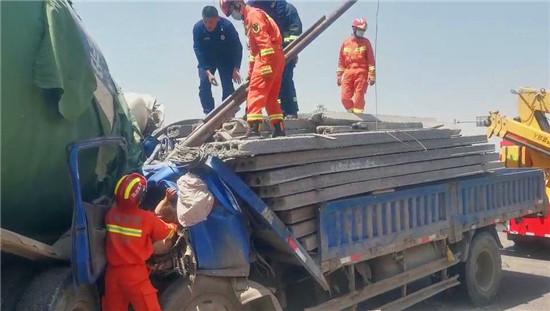 4月26日11時許,西華縣逍遙鎮(zhèn)加河灘村穎河橋發(fā)生一起車禍,一輛拉石板的貨車和一輛水泥罐車相撞,貨車在強大的慣性下車頭嚴(yán)重變形,司機被困車中,而貨車的駕駛室也被由于慣性發(fā)生前傾的石板壓住,情況十分緊急。周口市消防救援支隊西華縣消防大隊接到報警后立即出動2車10人趕赴現(xiàn)場展開救援。