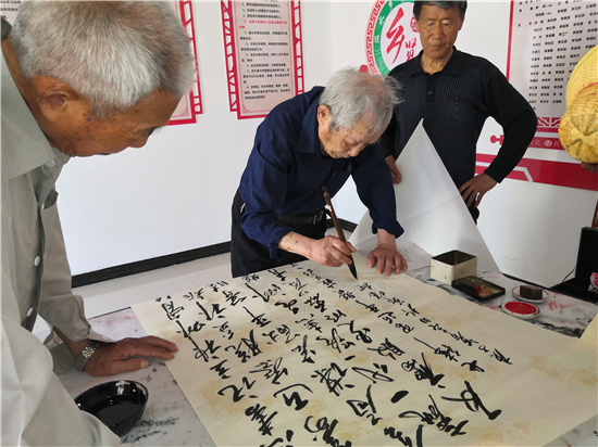 曾慶祥、李宏亮、閆子明、朱好明、單建勛、劉祖祥等9名老年書(shū)畫(huà)名家一下車(chē),顧不上休息,就紛紛潑墨揮毫,現(xiàn)場(chǎng)為群眾義寫(xiě)義畫(huà)486幅,為村民們獻(xiàn)上一場(chǎng)難得一遇的文化盛宴。雖然天氣炎熱,但是書(shū)畫(huà)家不辭辛苦,就連已經(jīng)89歲的李宏亮老師中間也不曾休息片刻,直到中午12:30才收筆,熱火朝天的工作激情贏得了干部群眾的一致好評(píng),也都豎起大拇指為他們點(diǎn)贊!