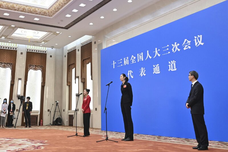 5月22日,第十三屆全國人民代表大會第三次會議舉行首場“代表通道”采訪活動。這是全國人大代表朱婷(右二)通過網(wǎng)絡視頻方式接受采訪。新華社記者 劉金海 攝